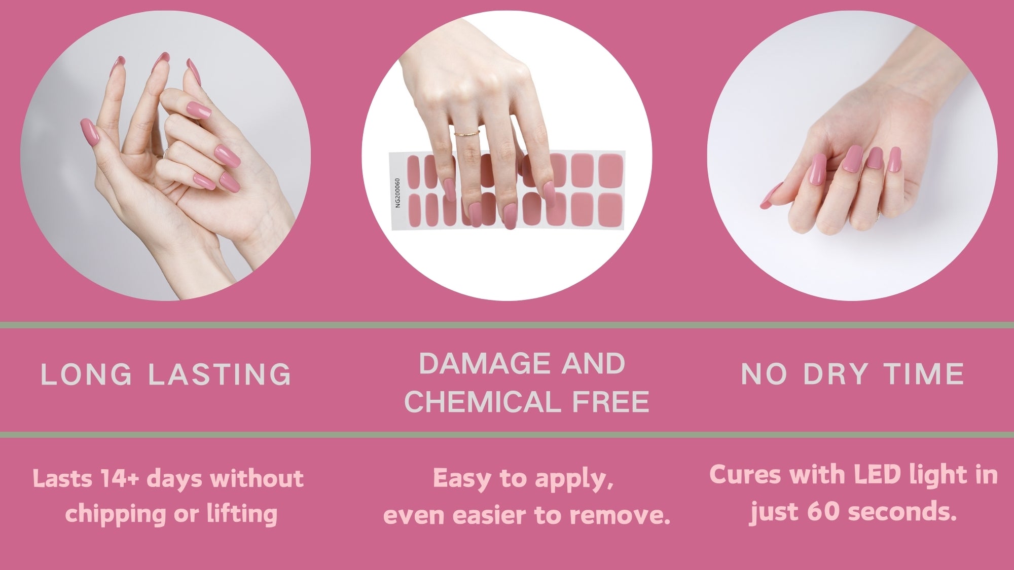 Stellen Sie sich vor, Gelnägel und Nagelsticker aus dem Salon hätten ein Baby. Das ist es. Halbgehärtet ist die neueste Technologie in der Nagelindustrie. Es sind Gelnägel aus dem Salon, aber nur halb so teuer, halb so schnell und ohne Nagelschäden. Unglaublich. (Aber es ist wahr.) Echtes flüssiges Gel ist zu 60 % auf dem Stickerbogen halbgehärtet. Es ist ein flexibles, dehnbares und tragbares Material, das sich an alle Nagelformen und -größen anpasst! Unter einer UV-Lampe härtet es 60 Sekunden lang zu 100 % aus.